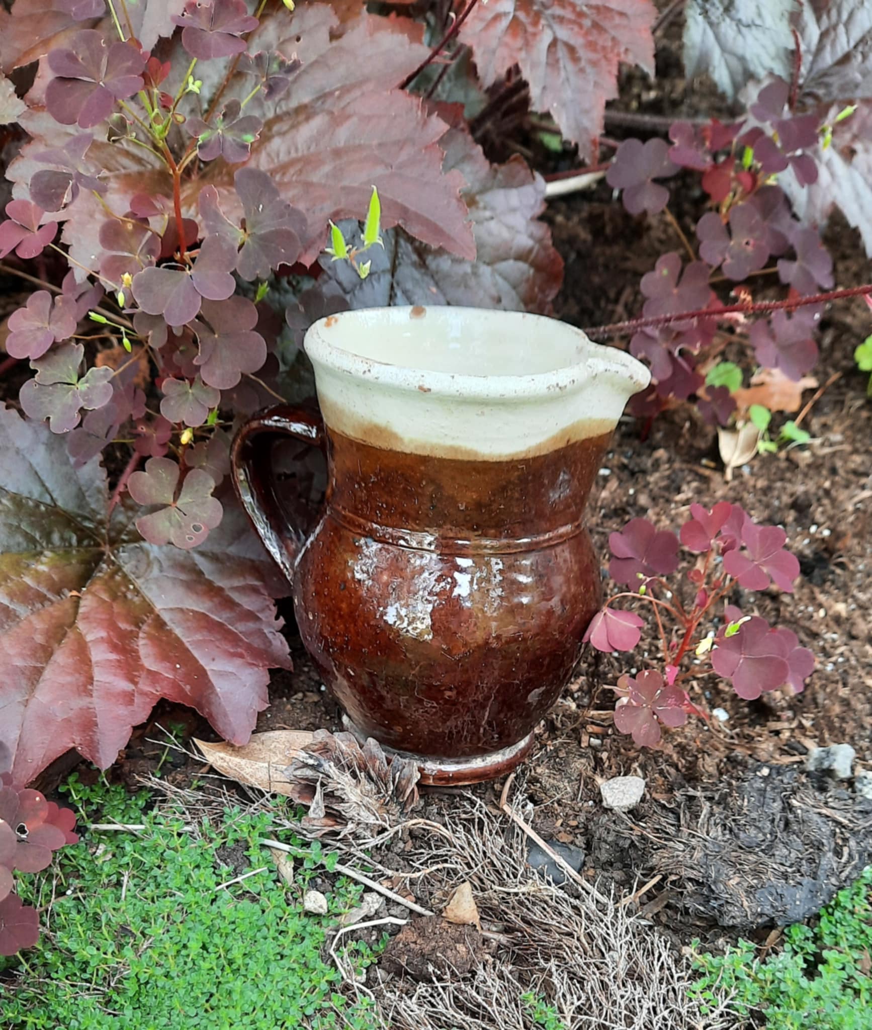 Flott Keramik mugge på 11cm med helletut. Denne er funnet i Frankrike , men kan også være fra Ungarn, Tyrkia eller Belgia, da de har veldig lik utførsel i de forskjellige landene. Men at den er flott er iallefall helt sikkert ❤️ Den bærer preg av å være godt brukt, full av patina ❤️ har nok vært brukt til vin eller oljer.