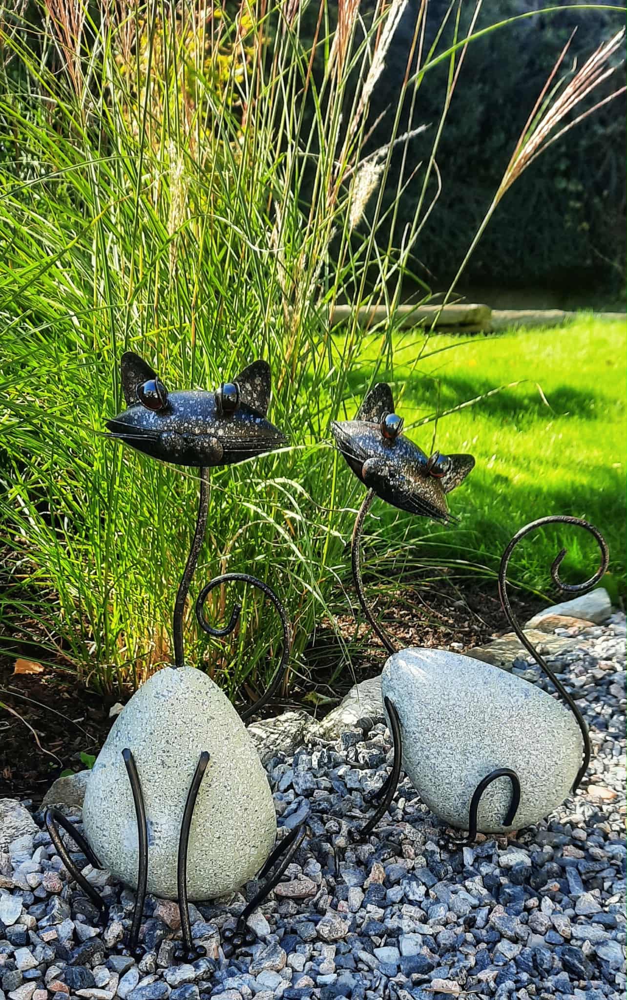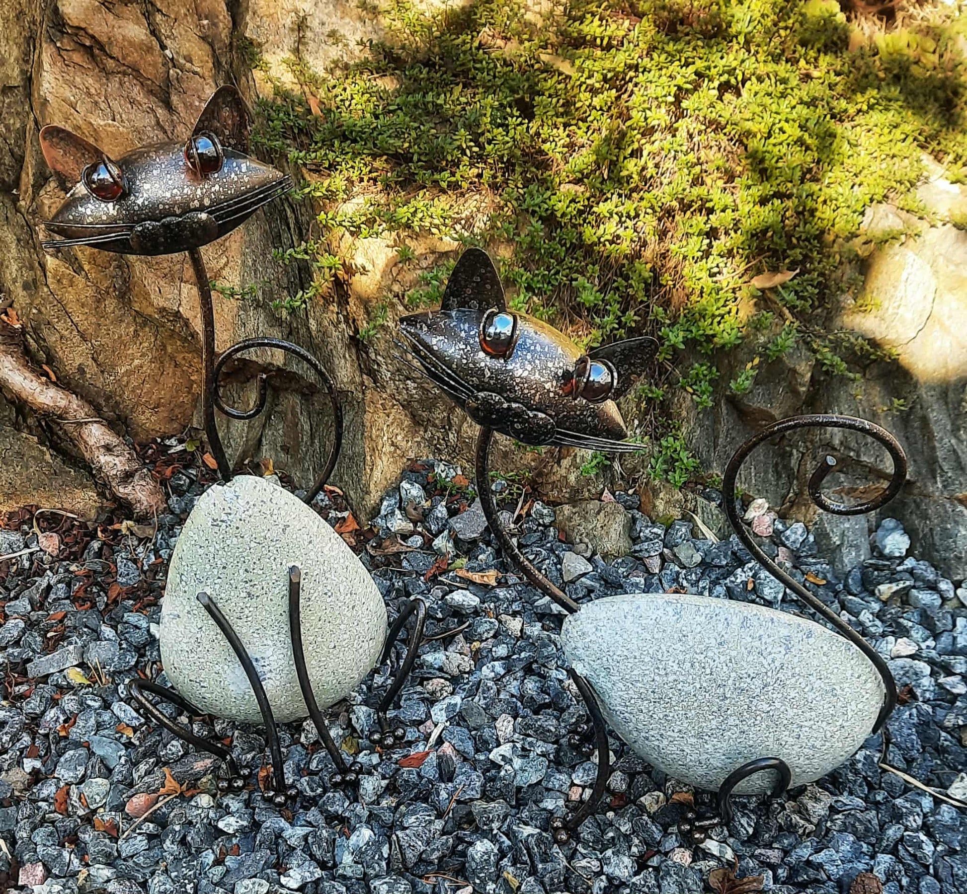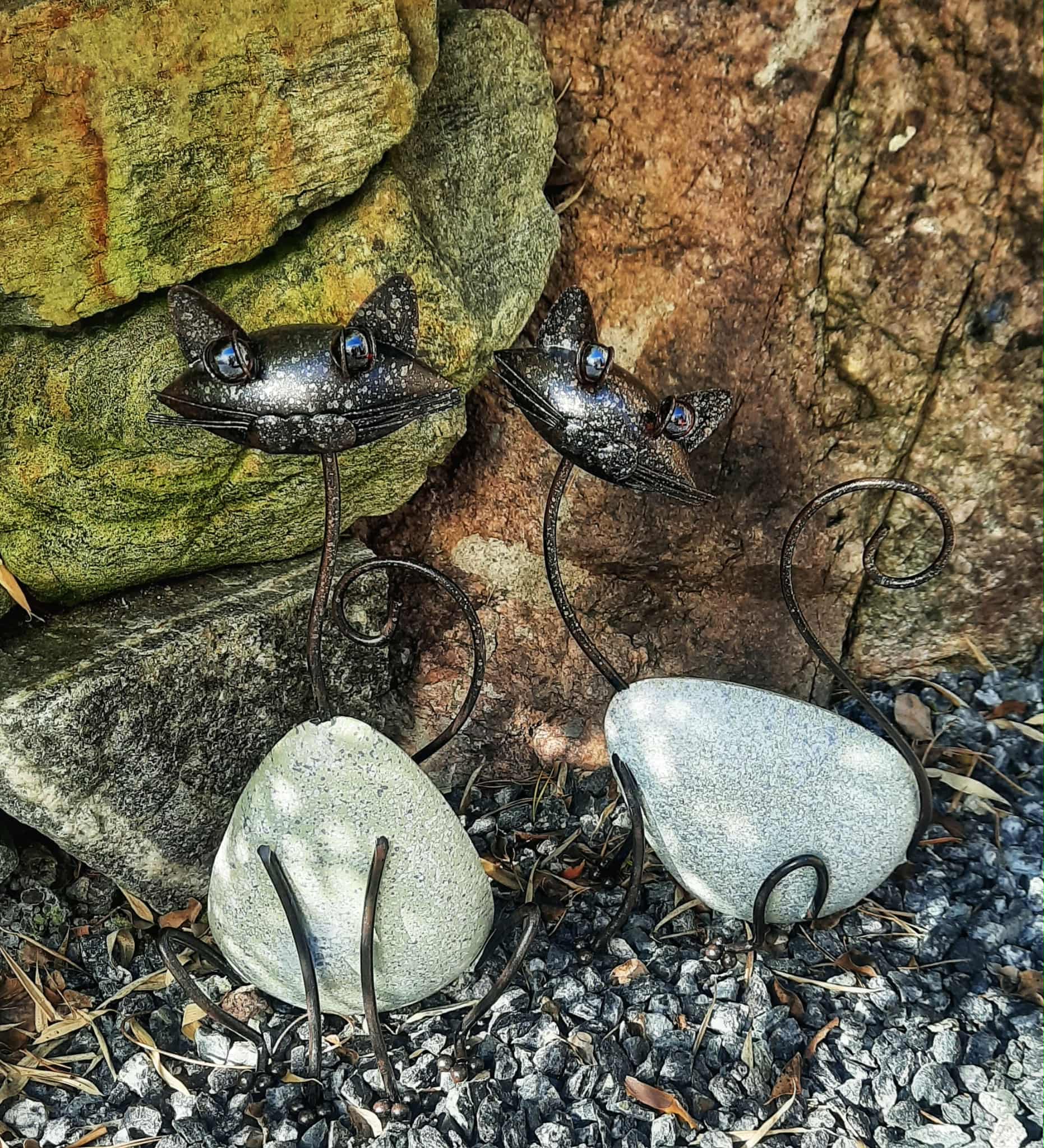 Søte katter laget av metall. Selve kroppen er også metall, øynene er glasskuler. Like fine inne som ute 🥰 Selges en og en men også som sett for de som ønsker det.