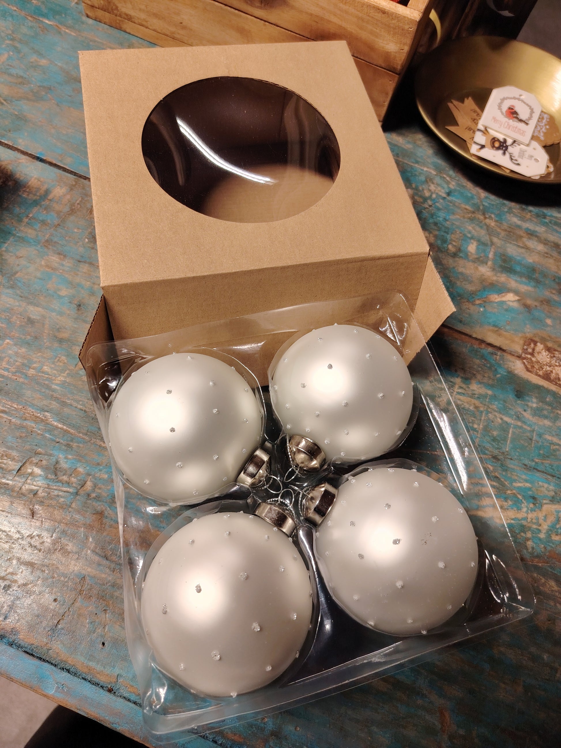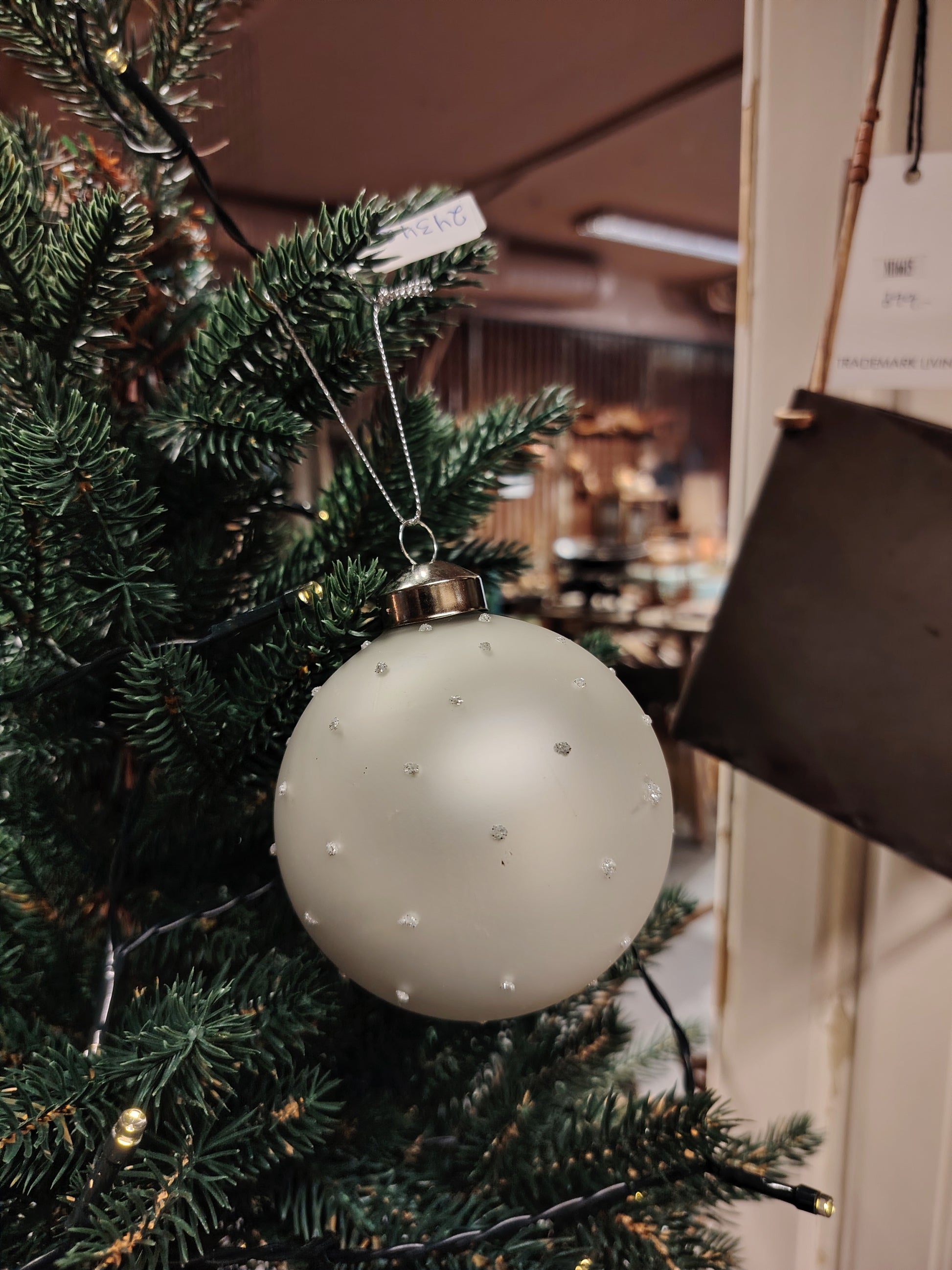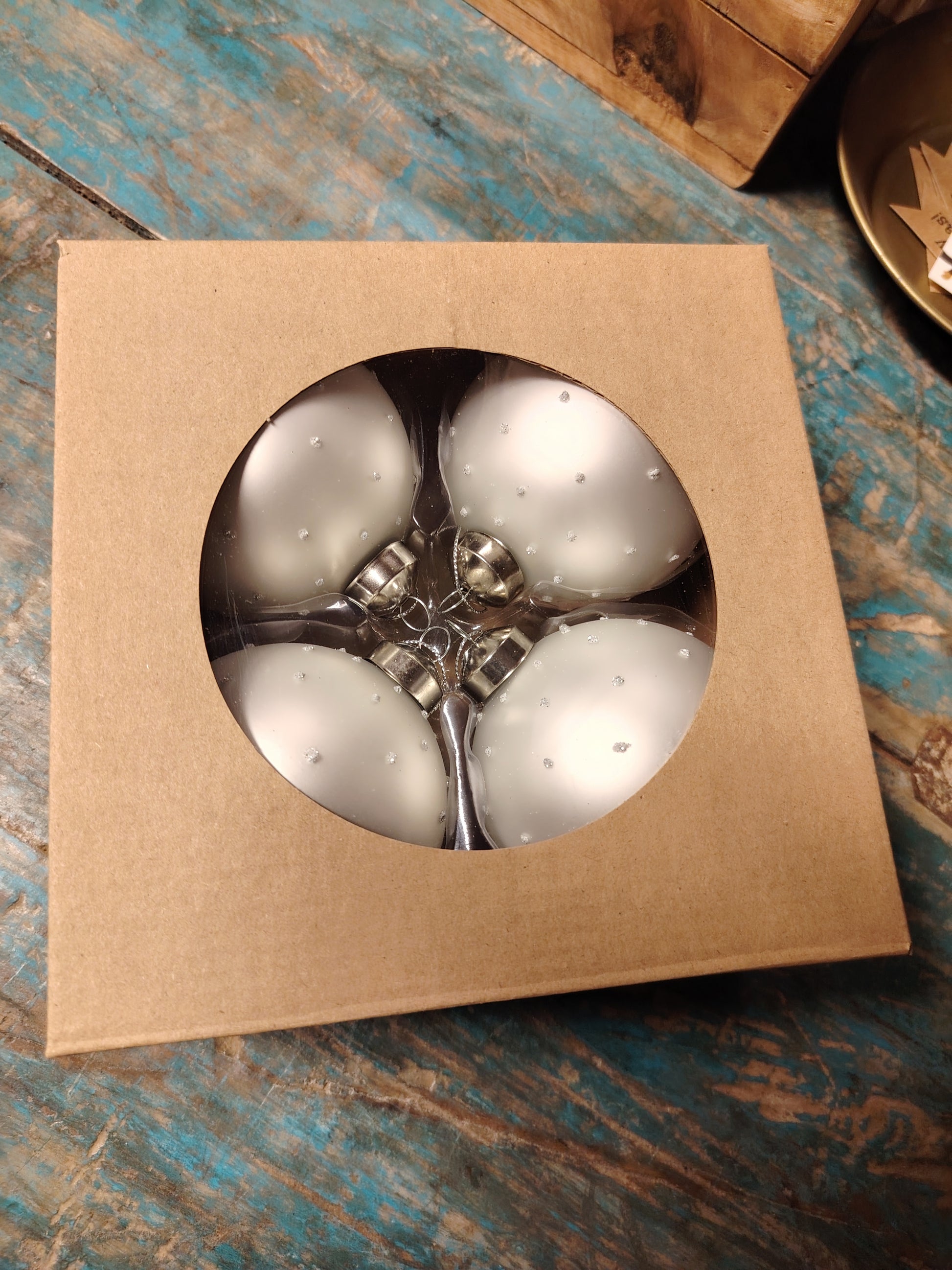 Nydelige Julekuler i Glass. Hvite med sølvprikker.
