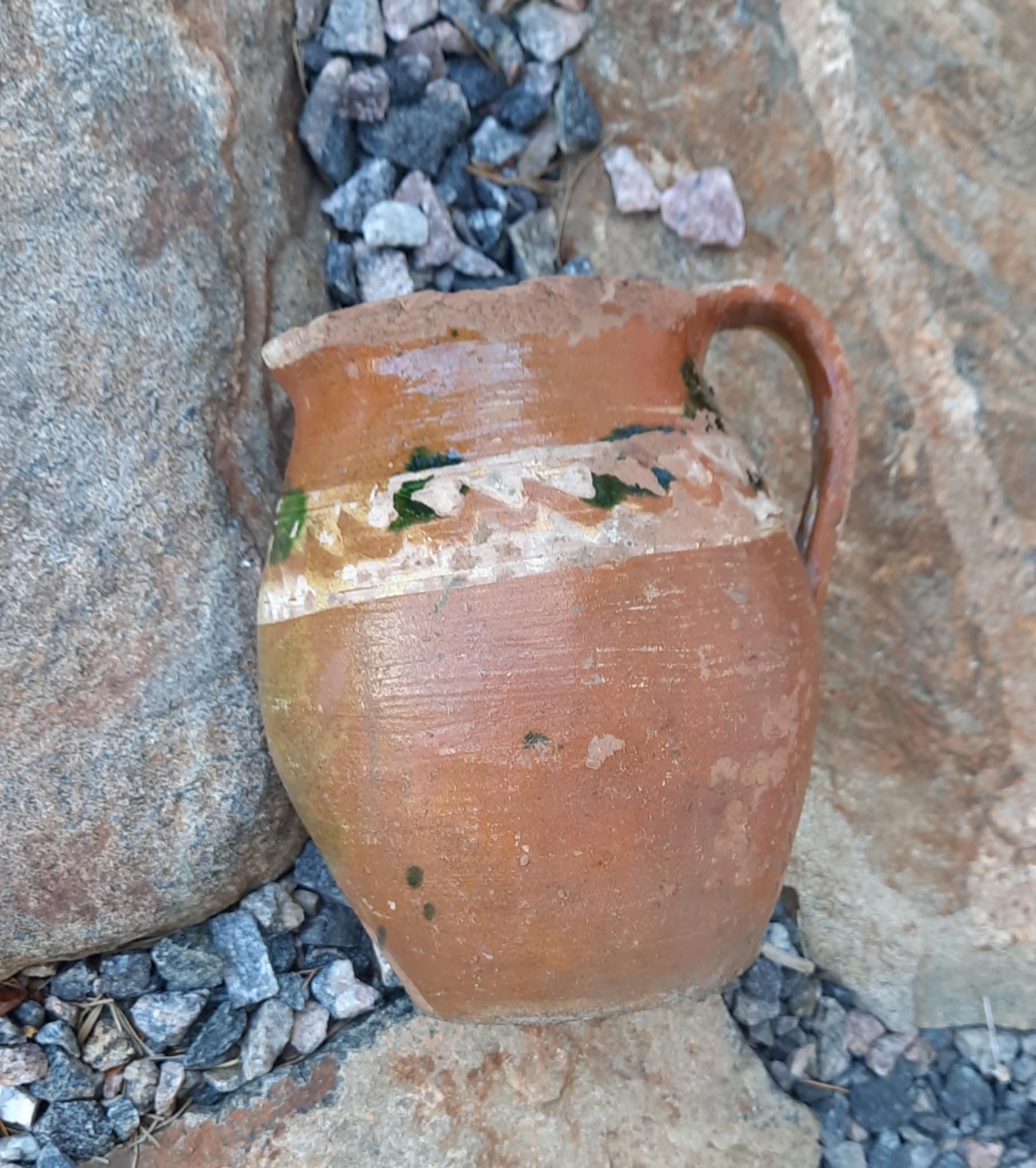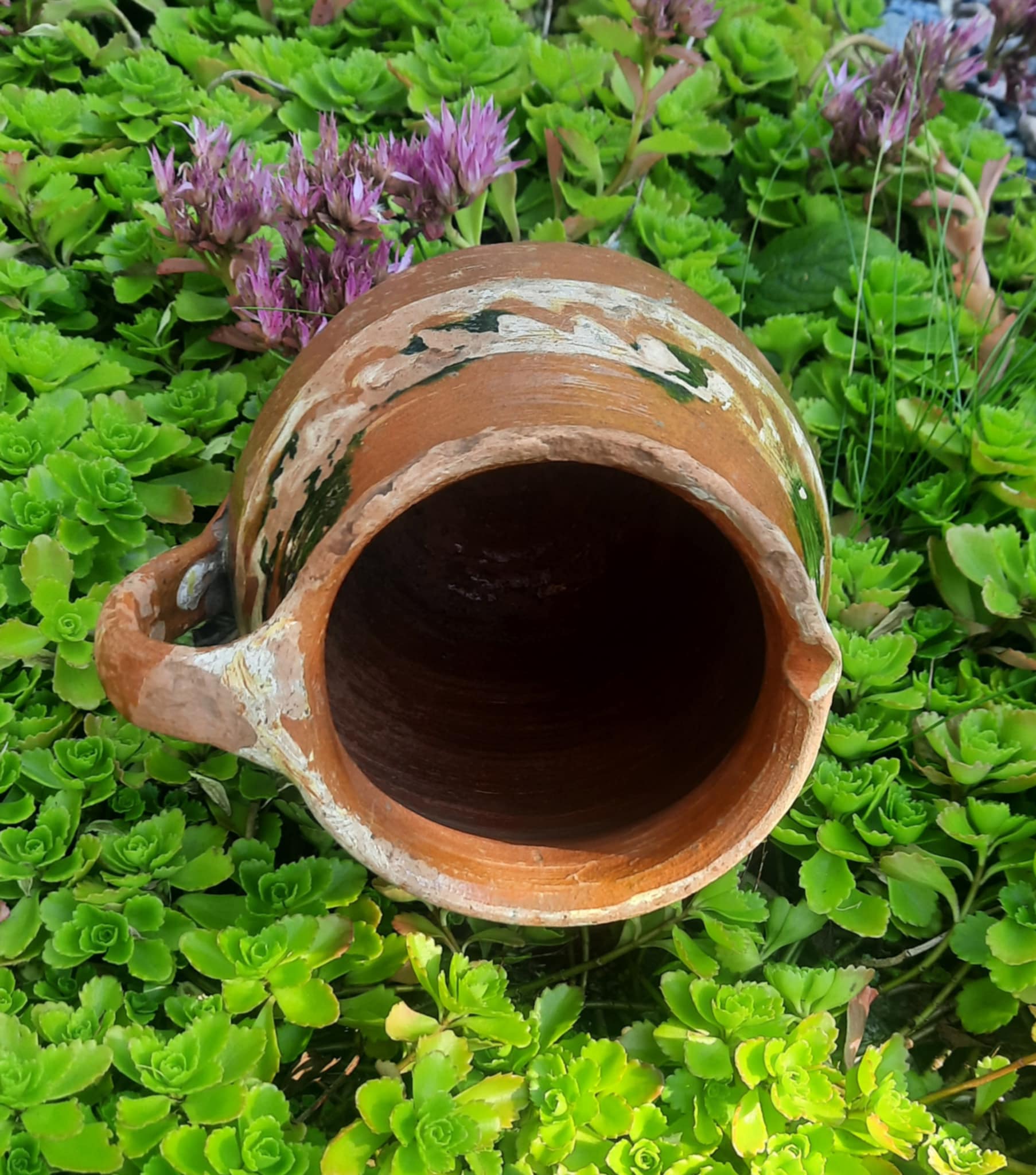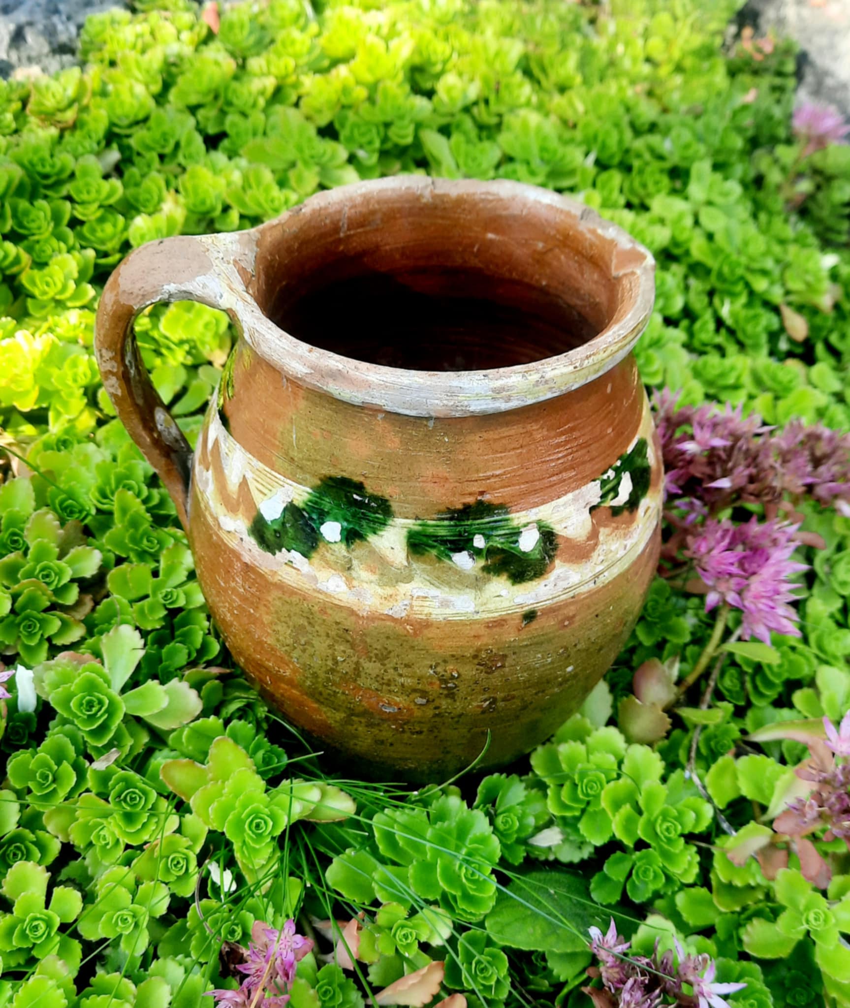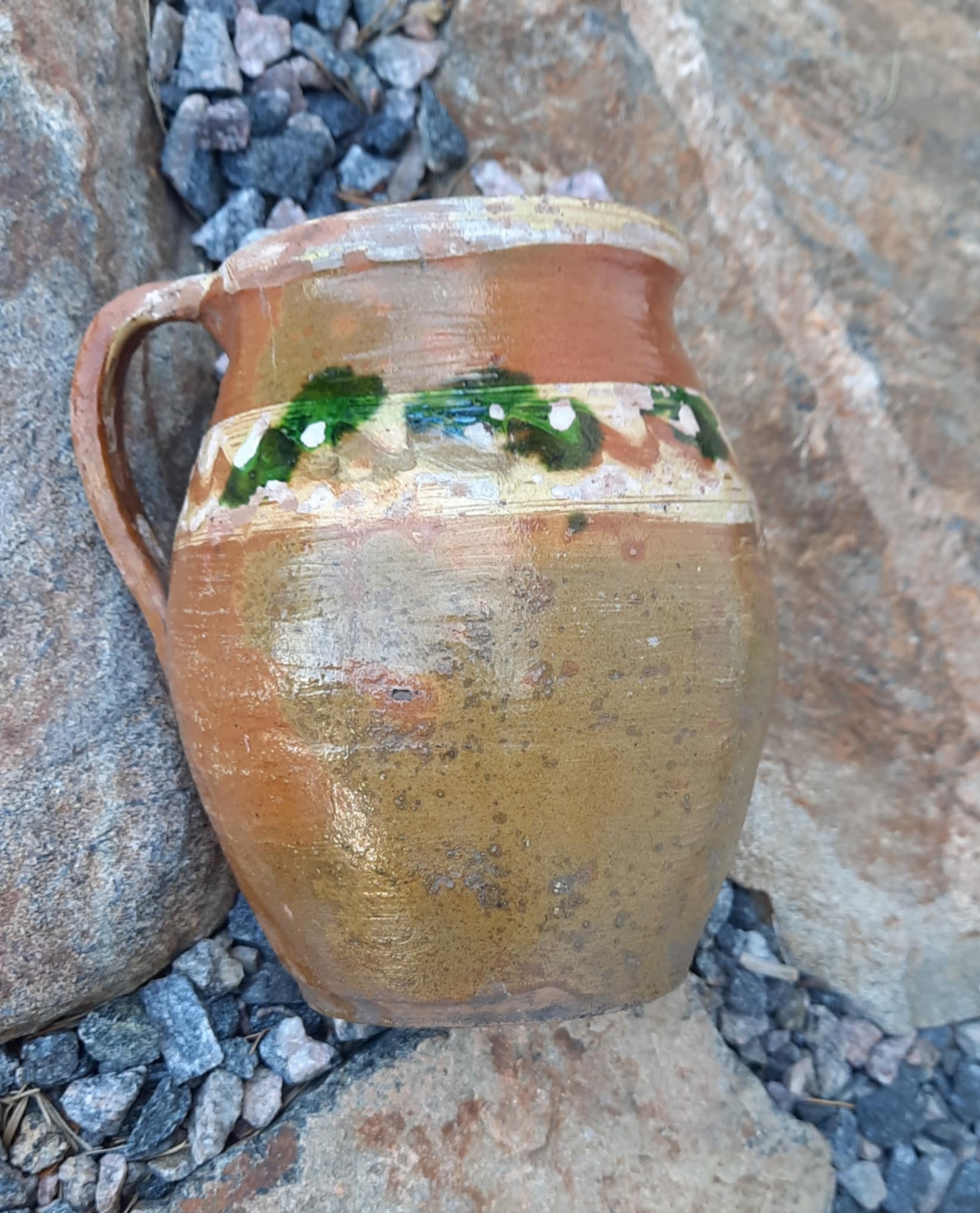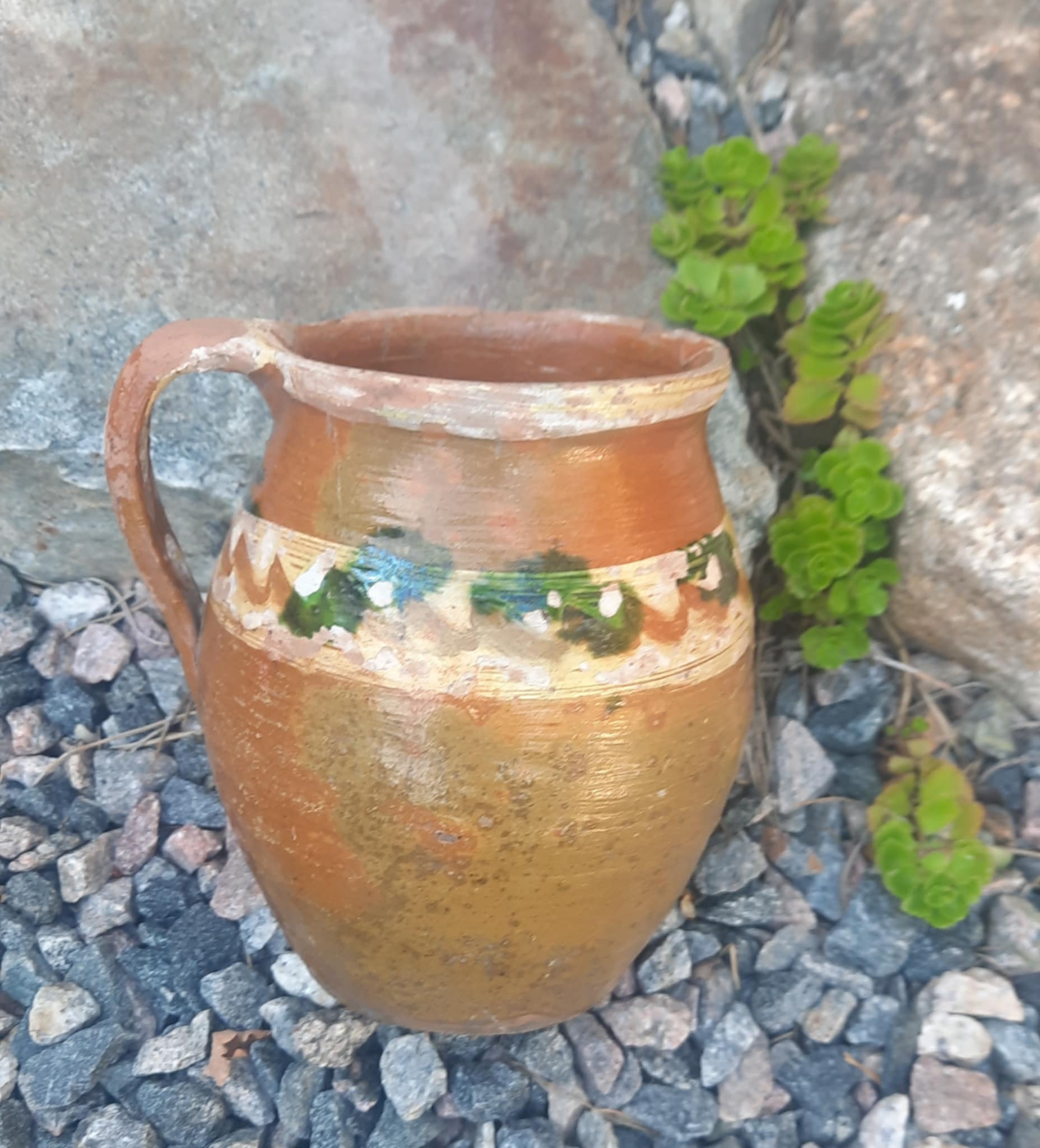 Nydelig liten håndlaget Keramik mugge på ca 16,5 cm. Denne er funnet i Belgia, men kan også være fra Ungarn, Tyrkia eller Frankrike, da de har veldig lik utførsel i de forskjellige landene. Men at den er flott er iallefall helt sikkert ❤️ Den bærer preg av å være godt brukt, full av patina ❤️ disse ble brukt til Olivenolje, vin, eddik osv.