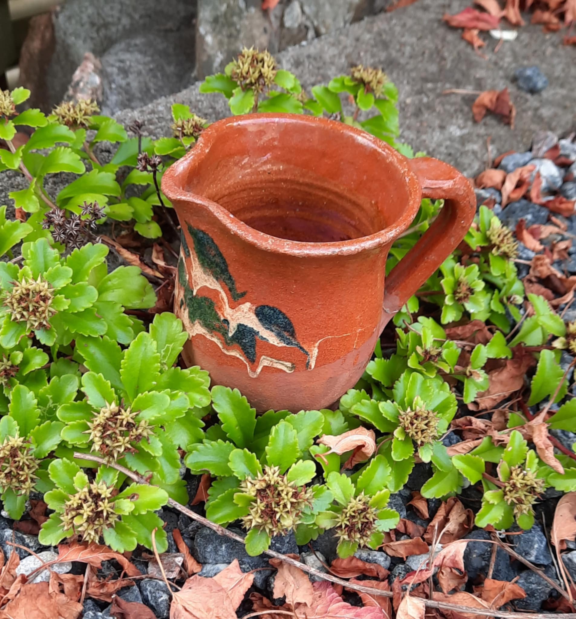 En av våre små unike krukker/mugger fra Belgia ❤️ som alle krukker, mugger, skåler og fat som vi kommer over på vår vei så kan vi jo ikke si med sikkerhet om den er laget i Belgia, Nederland, Frankrike, ungarn eller et annet land, da de bruker mye av samme farger og mønster 😊 Men en ting kan vi si og det er at alle disse flotte keramikk/teracotta arbeidene er unike. Alle er håndlaget og ingen er helt like ❤️ kan brukes til matvarer /drikke eller som en liten vase, er jo også nydelig dekor i seg selv 😊
