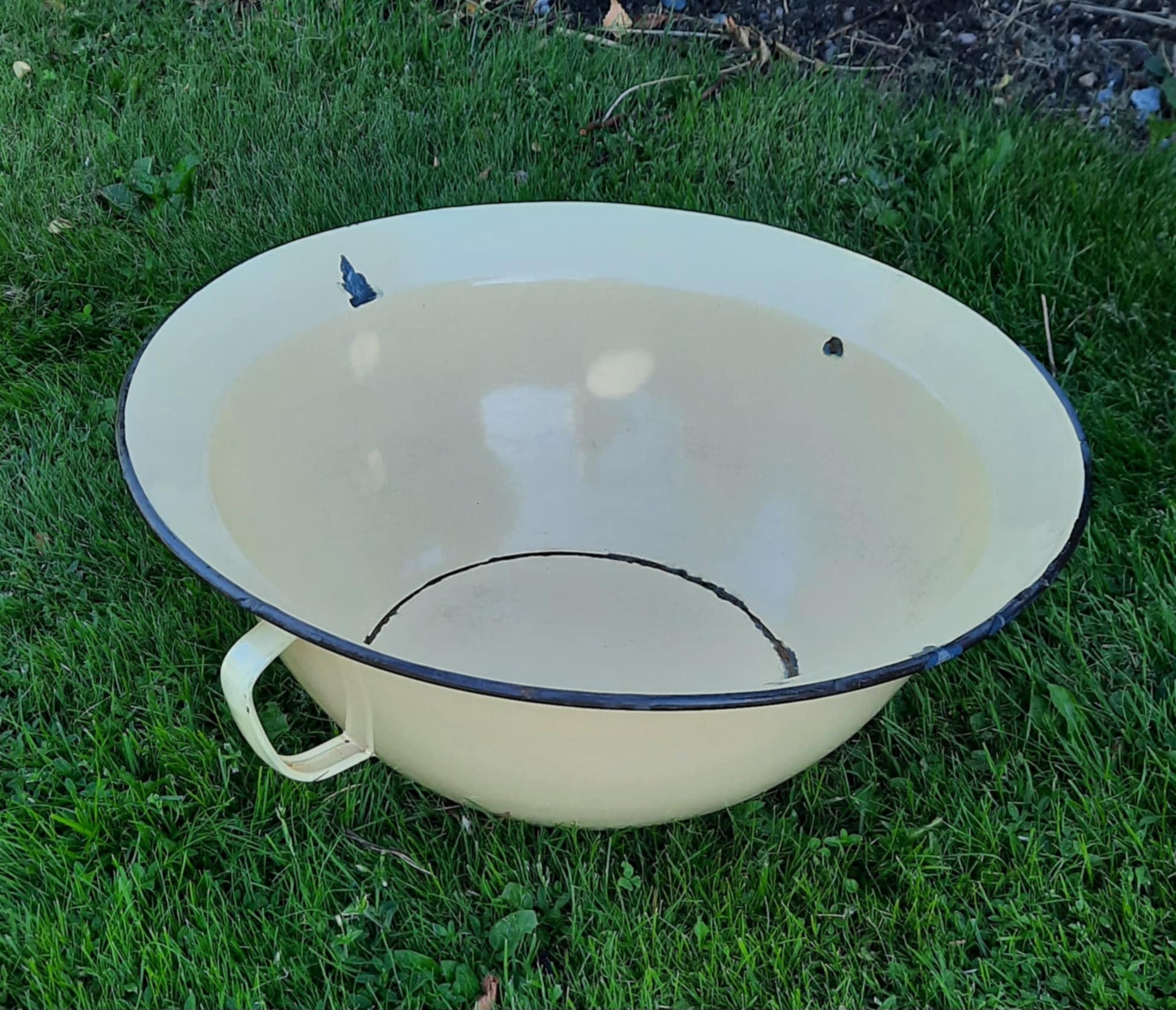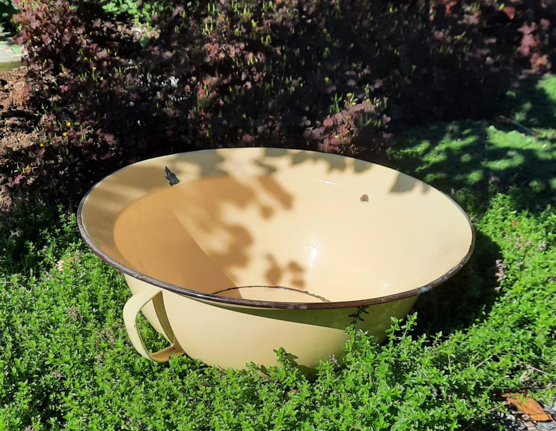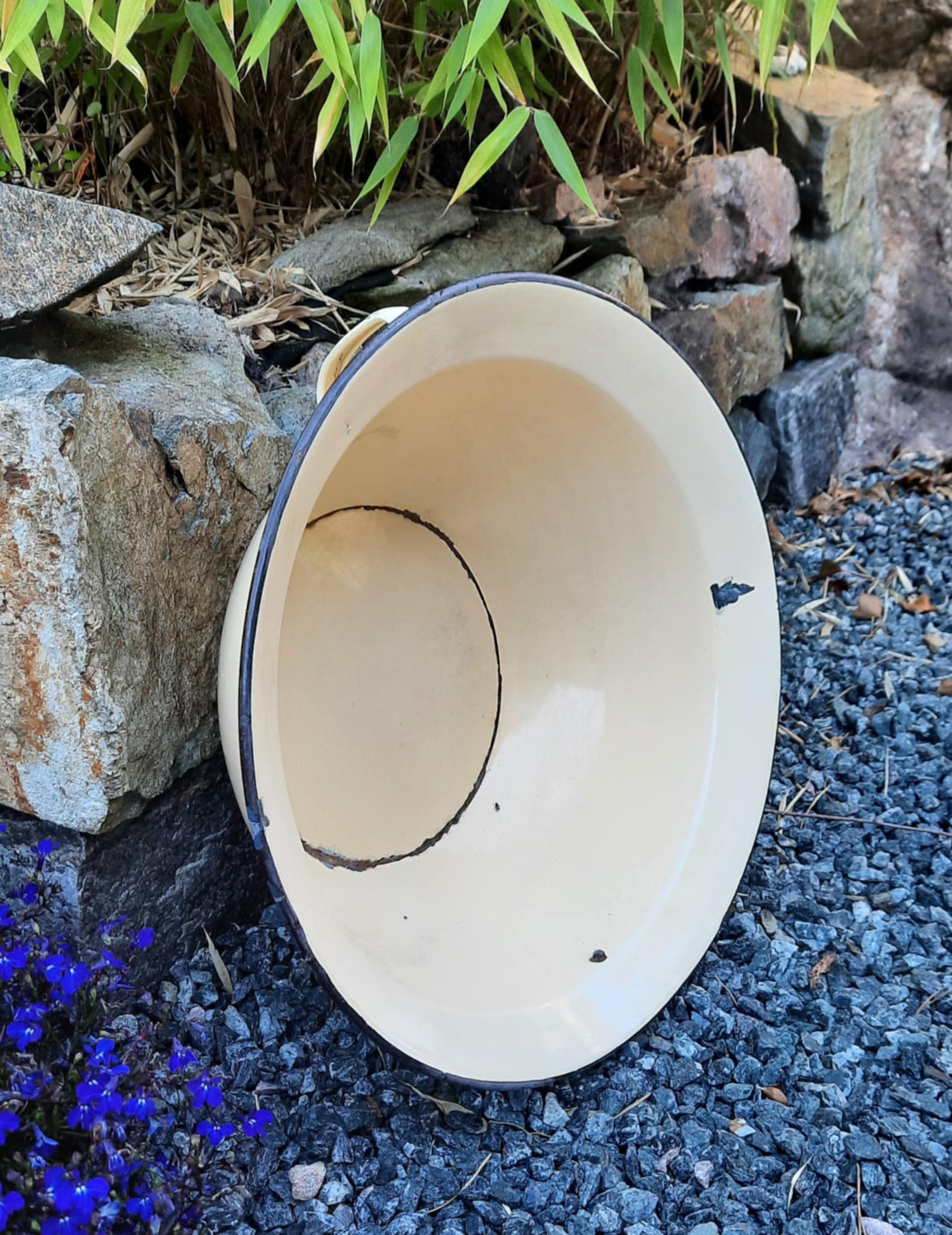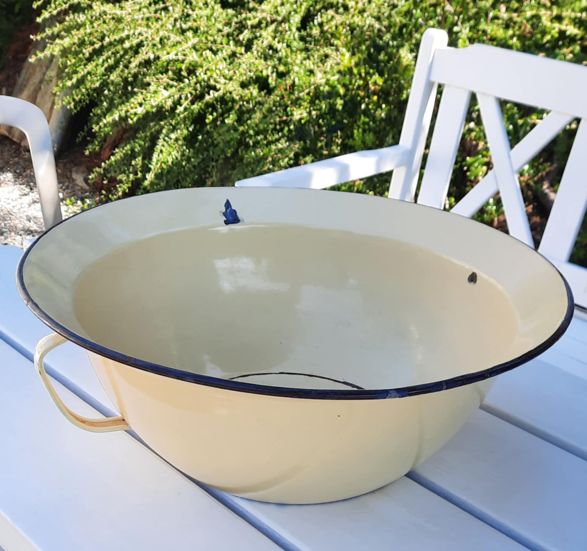 Nydelig vintage emaljefat med hanker/ører. Skaper en landlig atmosfære både inne og ute ❤️